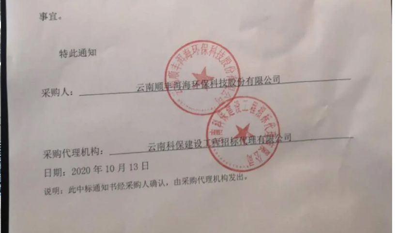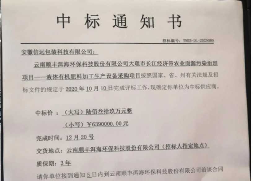 2020年10月13日我公司成功中標“云南順豐洱海環(huán)??萍脊煞萦邢薰敬罄硎虚L江經(jīng)濟帶農(nóng)業(yè)面源污染治理項目——液體有機肥料加工生產(chǎn)設備采購項目”,中標金額:639萬元。