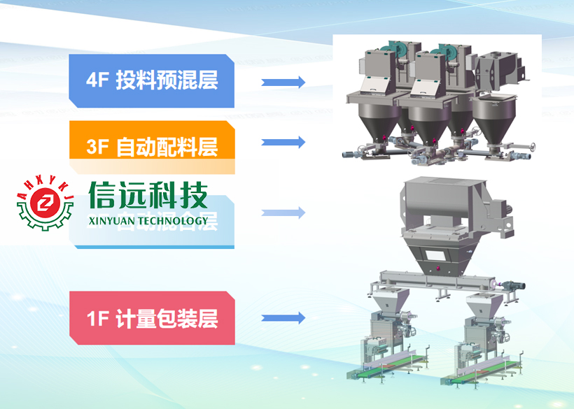 今天就由安徽信遠包裝科技小編帶大家了解一下全自動粉劑水溶肥生產(chǎn)線的組成部分。全自動粉劑水溶肥生產(chǎn)線大體上由4層結構組成。從上至下,第4層投料預混層,第3層自動配料層,第2層自動混合層,第1層計量包裝層。如下圖