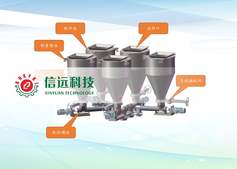 全自動(dòng)粉劑水溶肥生產(chǎn)設(shè)備中自動(dòng)配料系統(tǒng)由稱重模塊、配料倉、進(jìn)料口、手動(dòng)插板閥、配料螺旋、振動(dòng)破拱六大部分組成。