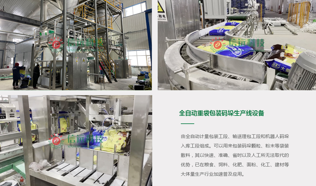 全自動(dòng)重袋/大袋包裝碼垛生產(chǎn)線設(shè)備是由全自動(dòng)計(jì)量包裝工段、輸送理包工段和機(jī)器人碼垛入庫(kù)工段組成??梢杂脕?lái)包裝碼垛顆粒、粉末等袋裝散料,其以快速、準(zhǔn)確、省時(shí)以及人工所無(wú)法取代的優(yōu)勢(shì),已在糧食、飼料、化肥、面粉、化工、建材等大體量生產(chǎn)行業(yè)加速普及應(yīng)用。