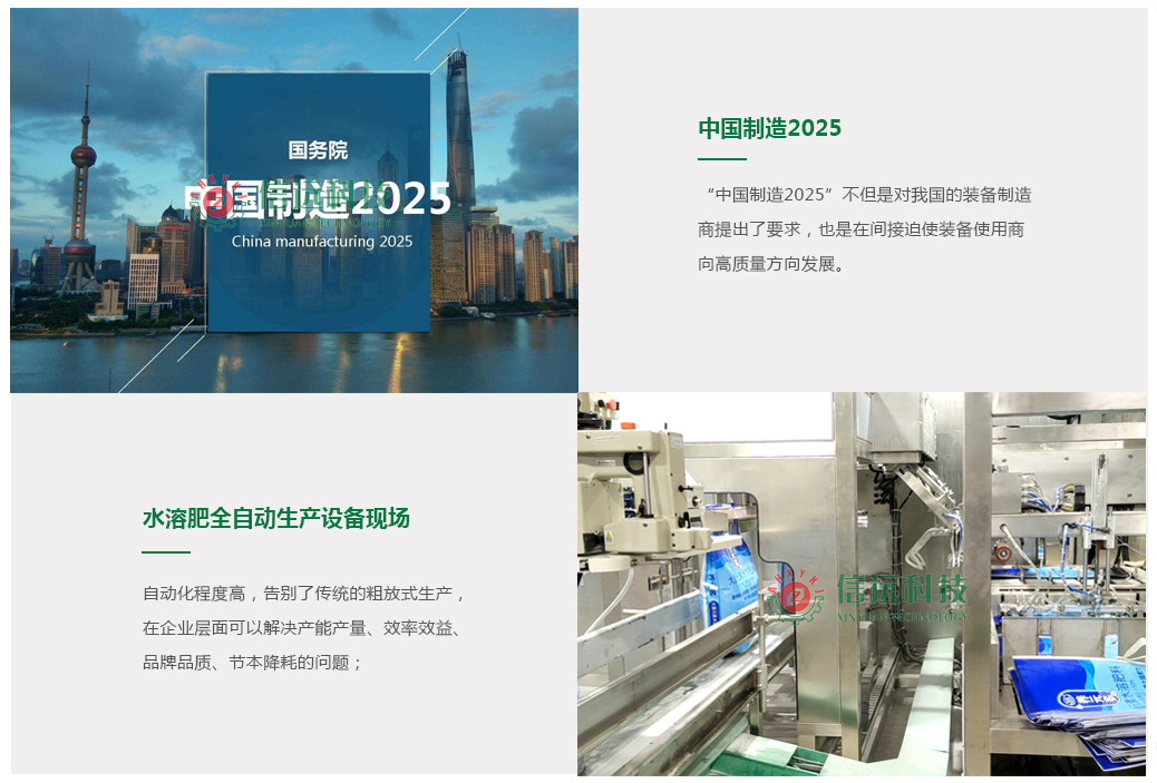 隨著“中國制造2025”工業(yè)化和信息化融合發(fā)展的推進(jìn)和創(chuàng)新驅(qū)動(dòng),質(zhì)量為先,綠色發(fā)展,結(jié)構(gòu)優(yōu)化的戰(zhàn)略指導(dǎo)思想的不斷深入。我國的工業(yè)制造水平得到了大幅度提升,尤其是水溶肥自動(dòng)化生產(chǎn)設(shè)備的研發(fā)、設(shè)計(jì)、制造和生產(chǎn)。但與發(fā)達(dá)國家相比,還有很長的路要走?!爸袊圃?025”不但是對我國的裝備制造商提出了要求,也是在間接迫使裝備使用商向高質(zhì)量方向發(fā)展。從而實(shí)現(xiàn)整體向前發(fā)展,與發(fā)達(dá)國家縮小距離,參與國際競爭。