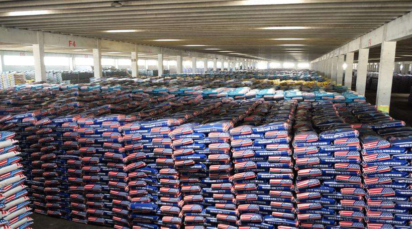 這套生產(chǎn)線設(shè)備是原料經(jīng)過(guò)人工投料后,配混設(shè)備會(huì)把不同配方的物料元素按照不同的配置比例進(jìn)行自動(dòng)配料和自動(dòng)混合?;旌暇鶆蚝蟮脑陷斔椭涟b機(jī)上方的儲(chǔ)料倉(cāng)斗內(nèi),倉(cāng)斗內(nèi)的物料通過(guò)快慢兩級(jí)螺旋給料的方式充填進(jìn)包裝袋中,包裝過(guò)程為全自動(dòng)化作業(yè),無(wú)需人工參與,即可完成自動(dòng)上袋、夾袋和充填物料,待稱(chēng)重傳感器檢測(cè)到袋內(nèi)物料重量達(dá)到設(shè)定數(shù)值時(shí),自動(dòng)停止充填、并自動(dòng)松袋落袋,落在輸送帶上的包裝袋將會(huì)自動(dòng)運(yùn)送至自動(dòng)折邊縫包機(jī)前進(jìn)行縫包成品。成品袋在輸送過(guò)程中,自動(dòng)完成倒包、振實(shí)、壓平等理包整形后,由機(jī)器人完成碼垛入庫(kù),日產(chǎn)量可以達(dá)到100噸左右。