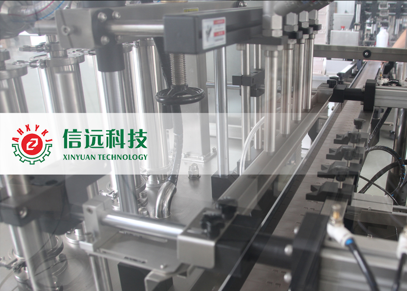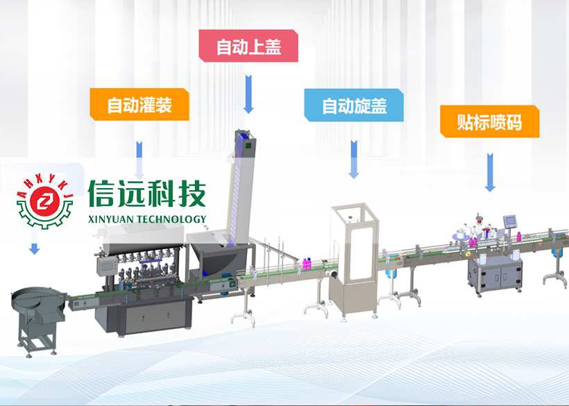 信遠科技瓶裝液體全自動灌裝機組,由理瓶機、灌裝機、上蓋/旋蓋機和貼標噴碼機組成??梢怨嘌b單瓶容量在50-1000ml范圍之間的液體物料,生產(chǎn)企業(yè)可以根據(jù)自己的需要,選擇不同型號的灌裝機和配套輔機。這套機組設備采用不銹鋼材質(zhì)設計制造,適用于食品、化工、醫(yī)藥等行業(yè)不帶氣體的流體、半流體物料的計量灌裝,具有自動完成理瓶、進瓶、定位、灌裝、出瓶、上蓋、旋蓋、鋁箔封口、貼標、噴碼等一系列功能。