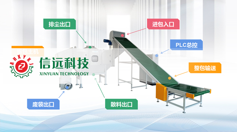 信遠(yuǎn)科技新一代全自動(dòng)破包機(jī),由運(yùn)送、破包、過濾、排塵、廢袋輸出等裝置組成。該機(jī)采用自動(dòng)切包和滾筒篩分的方式,對(duì)25-50kg重量的袋裝粉料或顆粒料在密閉狀態(tài)下進(jìn)行拆包、篩分和卸料。適用于不同材質(zhì)和型號(hào)的編織袋、PP/PE袋、牛皮紙袋等袋裝物料的拆包卸料工作。