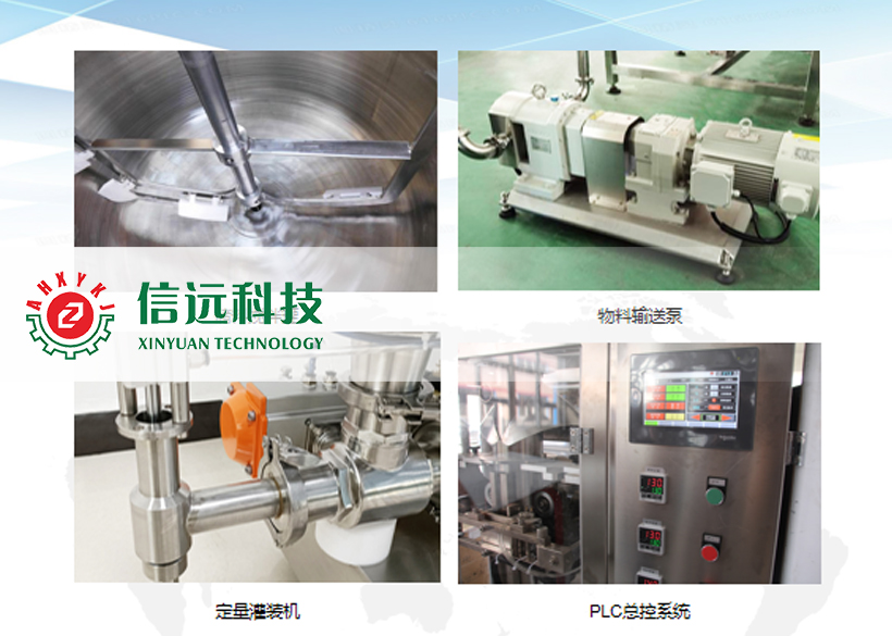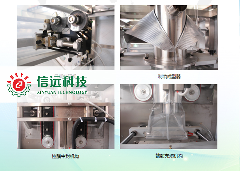信遠科技液體全自動立式制袋包裝機組,是由密閉攪拌罐、物料輸送泵、定量灌裝機、制袋包裝機和成品輸送機組成。可以包裝單袋克重在30-5000g范圍之間的液體物料,生產(chǎn)企業(yè)可以根據(jù)自己的需求選擇不同的設(shè)備型號。這套機組設(shè)備適用于食品、化工、醫(yī)藥等行業(yè)的流體、半流體物料的定量包裝,具有自動完成攪拌、送料、計量、制袋、灌裝、封口、切包、打印、計數(shù)、輸送等一系列功能。