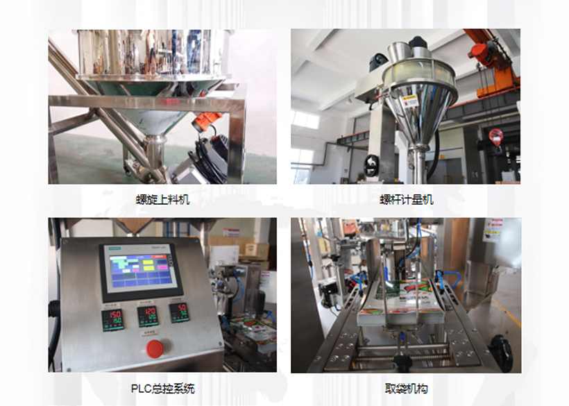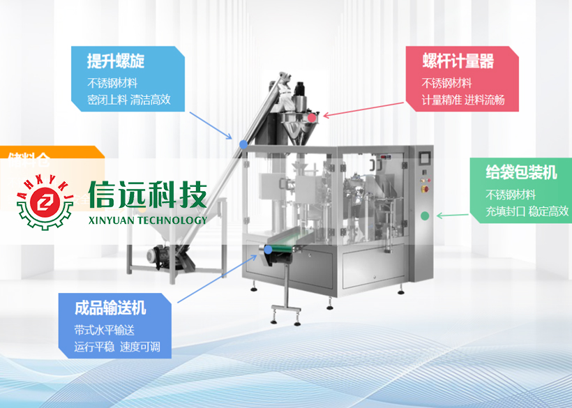 信遠(yuǎn)科技粉劑全自動旋轉(zhuǎn)式給袋包裝機(jī)組,是由密閉螺旋提升機(jī)、螺旋計量機(jī)、多工位旋轉(zhuǎn)式給袋包裝機(jī)和成品輸送機(jī)組成??梢园b單袋克重在30-5000g范圍之間的粉狀物料,生產(chǎn)企業(yè)可以根據(jù)自己的需求選擇不同的包裝機(jī)型號。這套機(jī)組設(shè)備適合無粘性粉料的定量包裝,具有自動完成送料、計量、給袋、充填、封口、打印、計數(shù)、輸送等一系列功能,是食品、化工、醫(yī)藥等行業(yè)提高包裝生產(chǎn)效率,打造無塵環(huán)保車間,提升包裝檔次的新型自動化裝備。