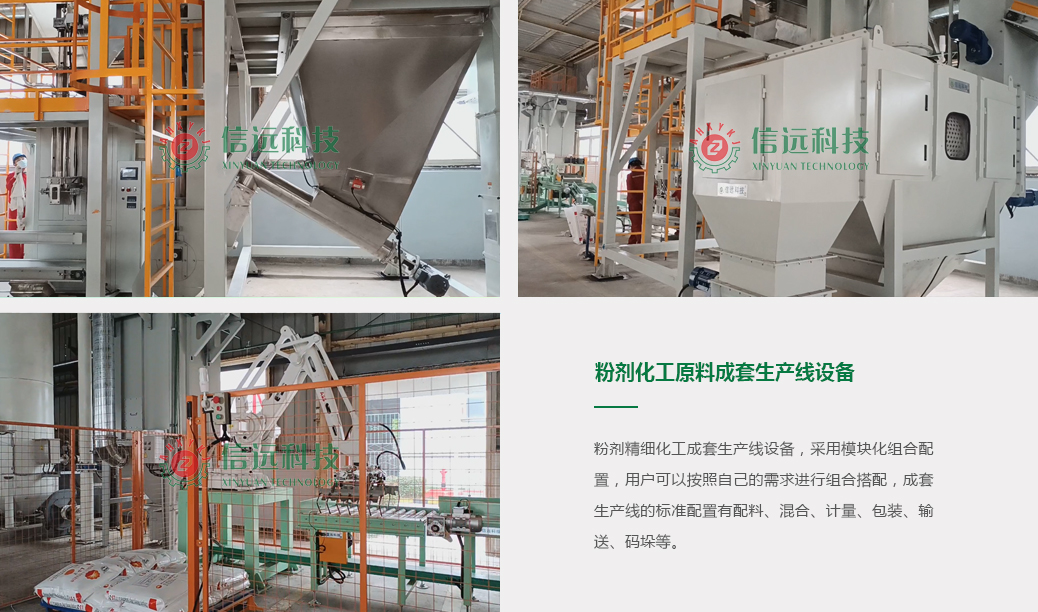 信遠(yuǎn)科技推出的粉劑精細(xì)化工成套生產(chǎn)線設(shè)備,采用模塊化組合配置,用戶可以按照自己的需求進(jìn)行組合搭配,成套生產(chǎn)線的標(biāo)準(zhǔn)配置有配料、混合、計量、包裝、輸送、碼垛等。其中包裝機(jī)提供了重袋、中袋、小袋包裝規(guī)格,包裝機(jī)類型有全自動和半自動,有單工位和雙工位,下料口有固定式和升降式。在充填環(huán)節(jié)配置有脈沖式除塵系統(tǒng),可以有效抑制粉塵外揚,整條生產(chǎn)線具有精準(zhǔn)高效、清潔環(huán)保的綜合優(yōu)勢。