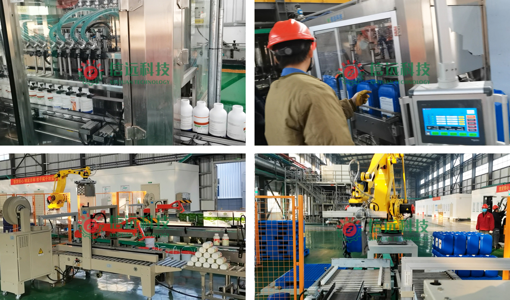 瓶裝灌裝系統(tǒng)適用于100-1000ml容量范圍內(nèi)的液體肥產(chǎn)品灌裝??梢宰詣油瓿衫砥窟M瓶和計量灌裝,當瓶內(nèi)重量達到設(shè)定值時,自動停止灌注,在輸送系統(tǒng)的推動下,出瓶至自動上蓋旋蓋、鋁箔封口和噴碼貼標工段,自動上箱開箱機把空箱輸送至裝瓶工段,當箱內(nèi)裝滿設(shè)定瓶數(shù)后,進入箱碼關(guān)聯(lián)、封箱捆扎和機器人碼箱工段,完成成品下線。桶裝灌裝系統(tǒng)適用于5-30L容量范圍內(nèi)的方桶、圓桶、廣口桶和小口桶的液體肥產(chǎn)品灌裝??梢宰詣油瓿缮贤斑M桶、稱重灌裝、上蓋壓蓋/旋蓋、噴碼追溯和機器人碼桶等作業(yè)工序,成品由叉車搬運入庫。