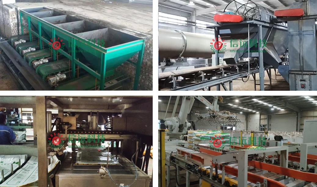 該套方案中的有機原料在一定周期內(nèi)通過翻堆通風(fēng)的方式完成發(fā)酵過程,腐熟后的原料經(jīng)過粉碎系統(tǒng)擠壓脫水進入配料和攪拌系統(tǒng),混合均勻的原料卸料至高速回轉(zhuǎn)的造粒系統(tǒng)完成球化成粒,成粒原料需要經(jīng)過烘干、冷卻和篩分過濾,篩分環(huán)節(jié)可以設(shè)置一級篩分、二級篩分,使成品率更高,顆粒度更好的有機原料進入包膜環(huán)節(jié)進行粒度定型鞏固,然后進入成品包裝環(huán)節(jié)。包裝工段可以實現(xiàn)自動取袋、上袋、套袋、夾袋、計量、充填,當(dāng)袋內(nèi)物料達(dá)到設(shè)定重量后,自動停止充填、自動松袋落袋、抱袋裝置自動推送至縫包機前,完成包裝袋封口。成品袋在輸送過程中,自動完成倒包、振實、壓平等理包整形作業(yè),機器人進行碼垛(雙包型抓手),叉車搬運入庫。