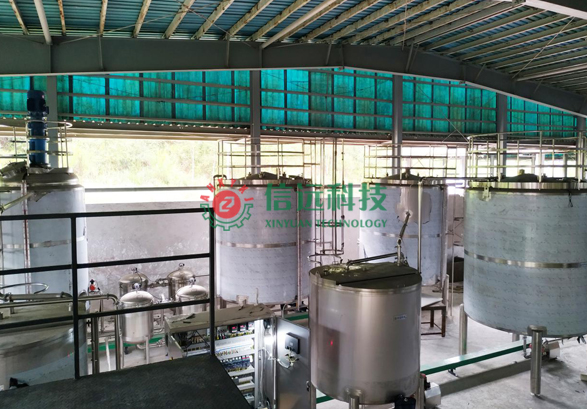 液體海藻魚蛋白肥成套生產(chǎn)設(shè)備,主要由原料預(yù)處理、酶解螯合、成品儲液、灌裝碼垛四大裝置工段組成。首先,藻類魚類主原料,需要按照技術(shù)標準進行預(yù)處理生產(chǎn);達到配料要求的海藻原料和魚類原料經(jīng)降解螯合,過濾除渣后,分別制備成海藻降解液和魚蛋白降解液;同時,把需要添加的中微量元素有益質(zhì)進行攪拌混合,制備成輔料液。然后主料液和輔料液按照質(zhì)量配比,先后投入到反應(yīng)釜內(nèi)進行復(fù)配攪拌螯合,制成液體海藻魚蛋白肥料產(chǎn)品。灌裝碼垛工段可以實現(xiàn)桶裝和瓶裝的自動灌裝、封口、噴碼、裝箱和機器人碼垛作業(yè)。