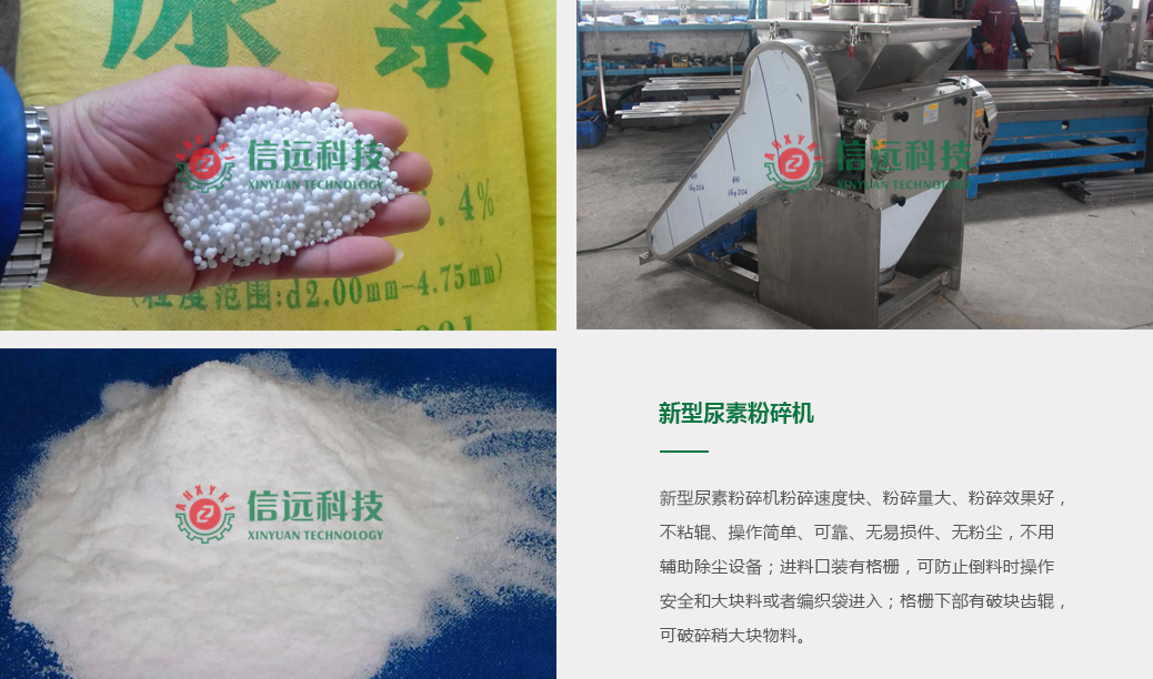 安徽信遠(yuǎn)包裝科技有限公司技術(shù)團(tuán)隊(duì)研發(fā)設(shè)計(jì)的新型尿素粉碎機(jī),已經(jīng)供應(yīng)投入市場(chǎng)。該設(shè)備主要用于顆粒尿素粉碎,也可以用于其它單一化肥原料的粉碎。廣泛用于復(fù)合肥廠高氮肥粉碎、水溶肥粉碎等。該尿素粉碎機(jī)運(yùn)用兩個(gè)高速相向運(yùn)轉(zhuǎn)的輥筒對(duì)顆粒原料進(jìn)行研磨擠壓,間隙大小決定其物料的粉碎程度,粉碎細(xì)度由雙輥間距控制,間距越小細(xì)度越細(xì),產(chǎn)量也會(huì)相對(duì)降低,加料越均勻粉碎效果越好,產(chǎn)量相對(duì)提高。