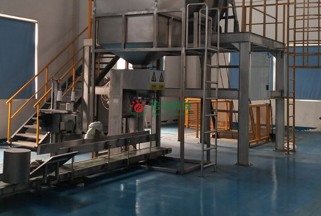 信遠科技的這款顆粒料無斗包裝秤的工作原理是:由人工先套上包裝袋,然后自動夾袋,系統(tǒng)檢測包裝袋到位后,無斗秤進行稱重去皮工序;喂料機根據(jù)控制儀表設定的程序進行快速加料,當落入包裝袋中的物料達到預定的慢速計量重量時,無斗稱開始慢速精確加料;稱重后,如果偏差太大,可報警通知人工處理或自動慢速補重,直至達到穩(wěn)定的預定重量,完成加料工序;當包裝秤判斷正常加料完成后,系統(tǒng)發(fā)出松袋信號,包裝袋下落,打印機打印標簽,產(chǎn)品進入封袋、包裝工序;不斷往復,實現(xiàn)自動化包裝的定值包裝。然后通過輸送機推送到縫包機前,完成包裝成品。