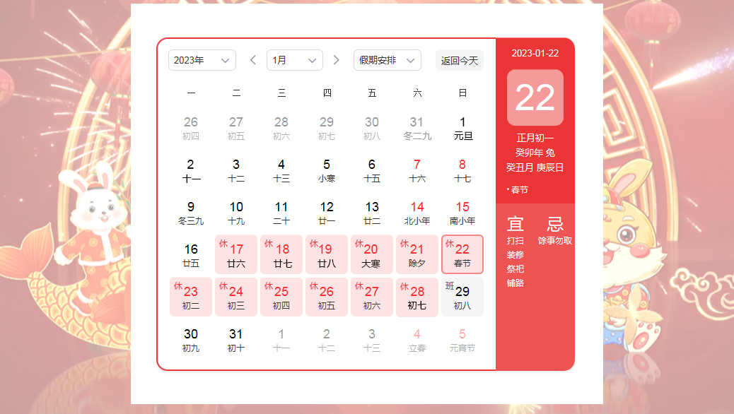 信遠(yuǎn)科技根據(jù)《國務(wù)院辦公廳關(guān)于2023年部分節(jié)假日安排的通知》精神,結(jié)合公司實(shí)際情況,現(xiàn)將2023年春節(jié)放假安排通知如下:2023年1月17日(臘月廿六)至1月28日(正月初七),共12天。1月29日(正月初八)正式上班。
