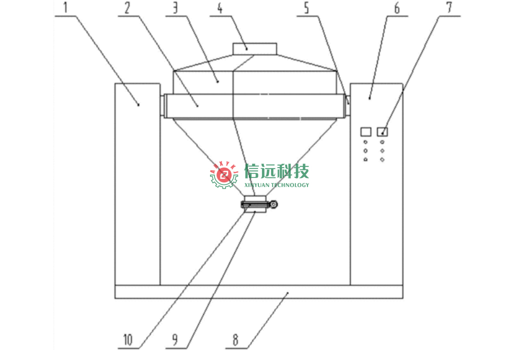 信遠科技方錐型混合機為立式結(jié)構(gòu),采用單錐體回轉(zhuǎn)堆積度物料比,進行交叉錯位混合,通過電機帶動減速機,并依次帶動帶輪、皮帶、轉(zhuǎn)軸、框架2和料筒3轉(zhuǎn)動,順時針為正轉(zhuǎn),逆時針為反轉(zhuǎn),達到混合效果,均勻度高。料筒3由制動電機任意傾斜定位角度,便于出料及清潔的需要。設(shè)有自動定時裝置,通過電控板7任意設(shè)置,可設(shè)定0~60分鐘自動停止。采用不銹鋼蝶閥10放料,無粉塵泄漏和飛揚現(xiàn)象出現(xiàn)。采用重力擴散原理混合,對物料的壓饋小,不會對物料產(chǎn)生剪切粉碎。料筒3采用304優(yōu)質(zhì)不銹鋼板制作,內(nèi)壁鏡面拋光處理,外表面亞光處理。大容積的混合機可配置真空上料系統(tǒng),提高工作效率和改善工作環(huán)境。