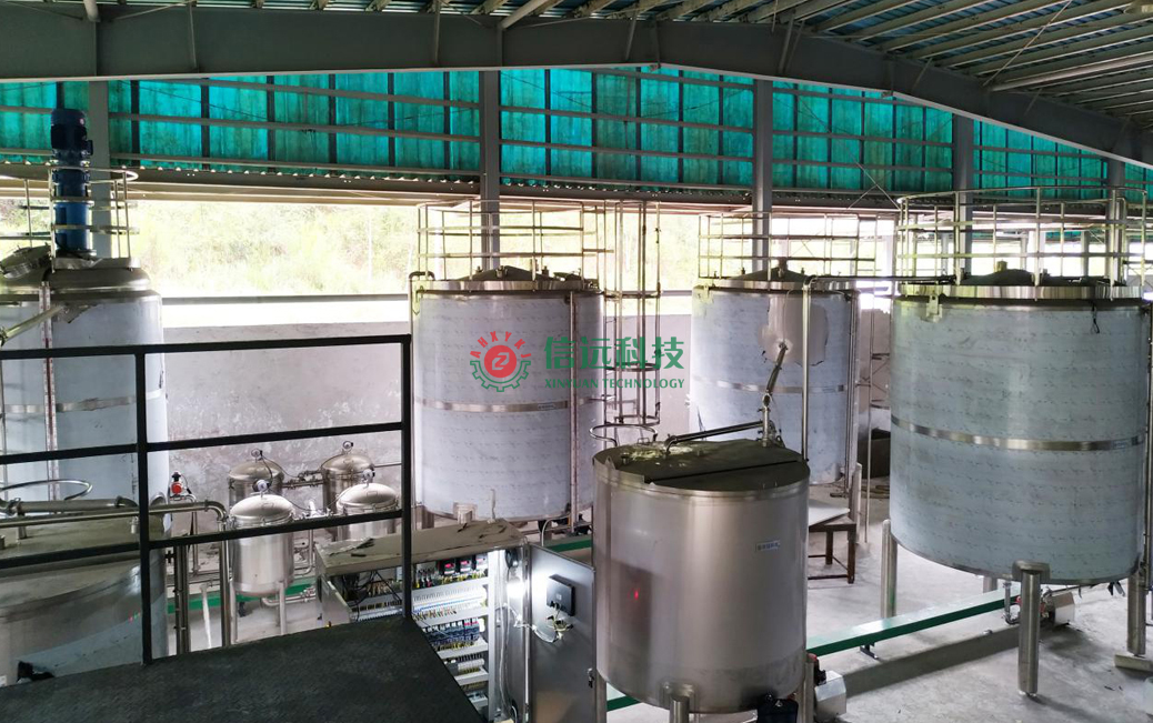 信遠科技液體魚蛋白肥成套生產(chǎn)設(shè)備,主要由原料預(yù)處理、酶解螯合、成品儲液、灌裝碼垛四大裝置工段組成。首先,藻類魚類主原料,需要按照技術(shù)標準進行預(yù)處理生產(chǎn);達到配料要求的魚類原料經(jīng)降解螯合,過濾除渣后,分別制備成魚蛋白降解液;同時,把需要添加的中微量元素有益質(zhì)進行攪拌混合,制備成輔料液。然后主料液和輔料液按照質(zhì)量配比,先后投入到反應(yīng)釜內(nèi)進行復(fù)配攪拌螯合,制成液體魚蛋白肥料產(chǎn)品。灌裝碼垛工段可以實現(xiàn)桶裝和瓶裝的自動灌裝、封口、噴碼、裝箱和機器人碼垛作業(yè)。