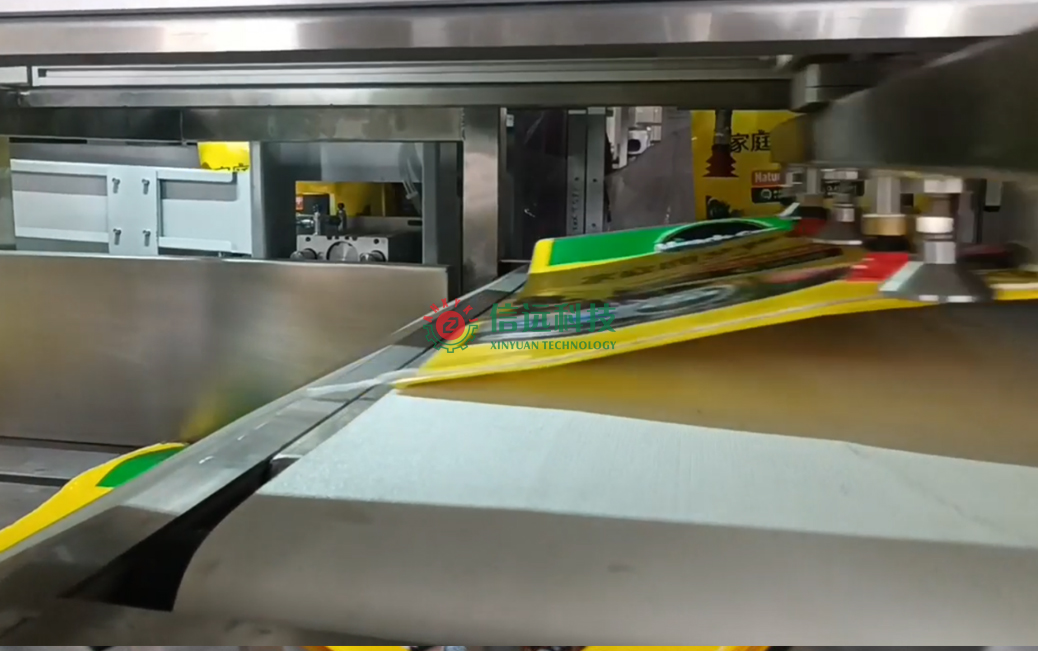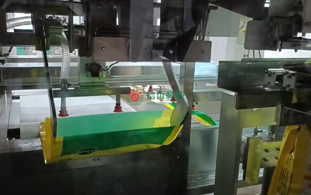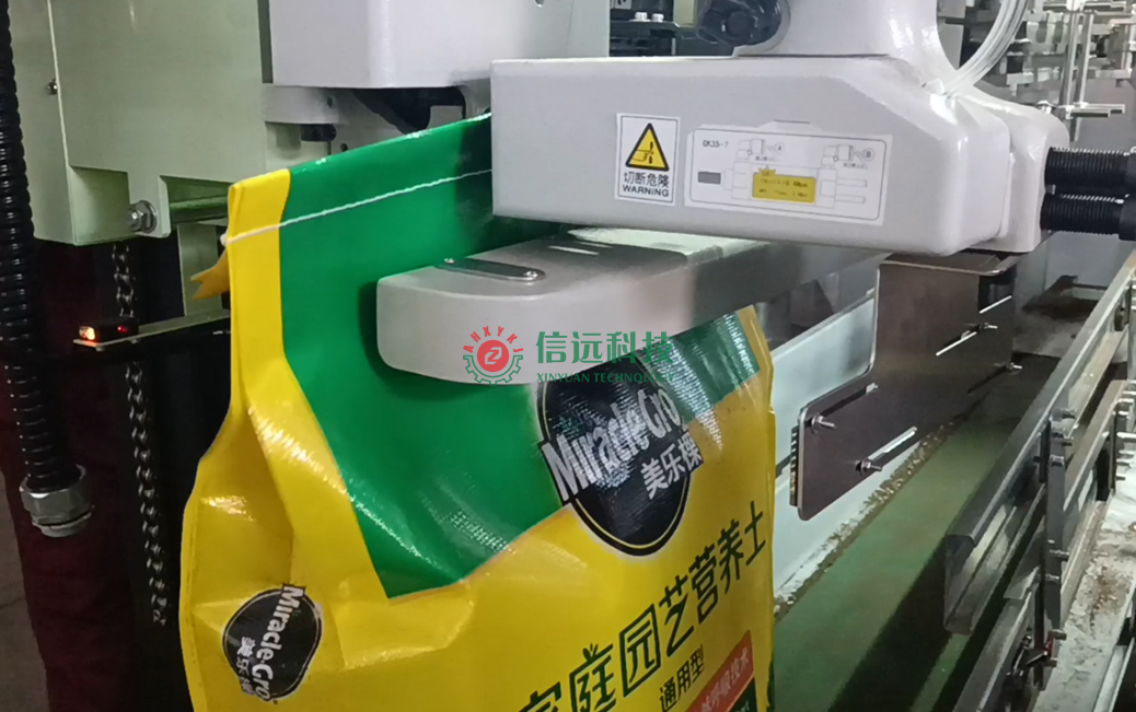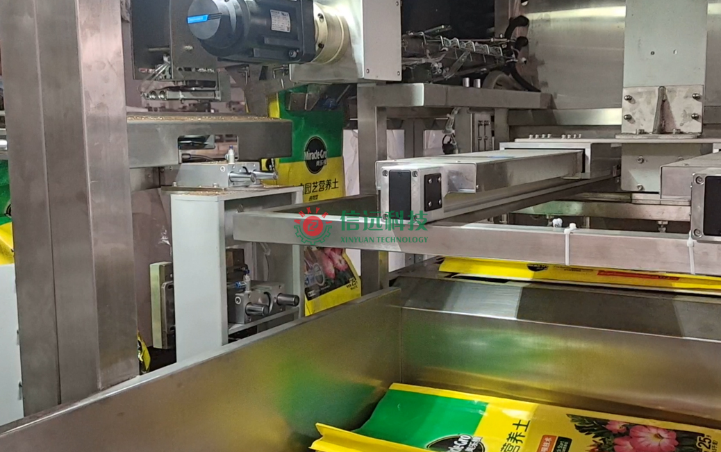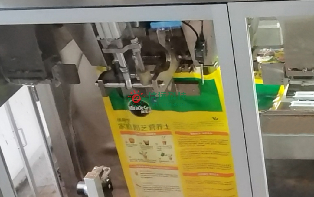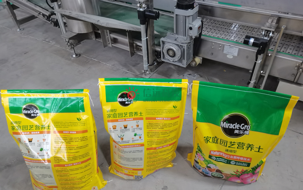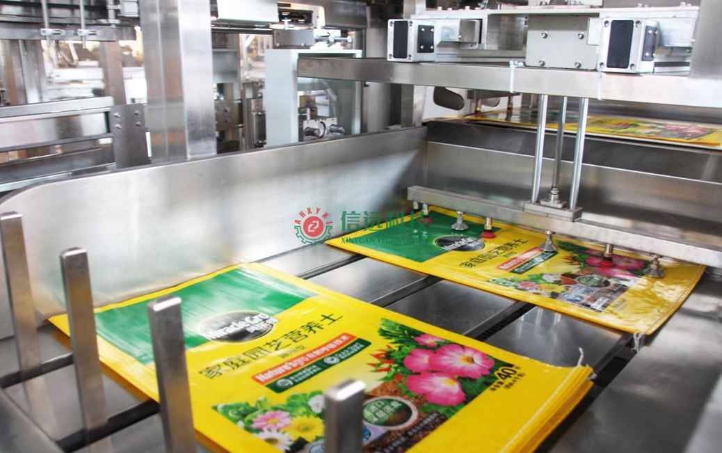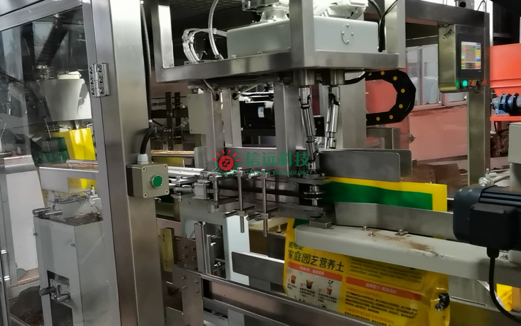 安徽信遠(yuǎn)包裝科技有限公司作為國(guó)內(nèi)知名的農(nóng)資農(nóng)化設(shè)備專(zhuān)業(yè)制造商,按約為該品牌營(yíng)養(yǎng)土生產(chǎn)商提供了成套的自動(dòng)化包裝機(jī)設(shè)備,該設(shè)備是一套給袋式重袋包裝系統(tǒng)。生產(chǎn)流程是配方原料通過(guò)計(jì)量料倉(cāng)喂料至重袋包裝機(jī),在前端上袋機(jī)的配合下,自動(dòng)完成取袋、上袋、套袋、夾袋、計(jì)量、充填、抱袋、振實(shí)等作業(yè);包裝機(jī)后端與縫包機(jī)相聯(lián),在導(dǎo)袋機(jī)構(gòu)和皮帶輸送機(jī)的配合下,自動(dòng)完成移栽、導(dǎo)袋、折邊、縫合、剪線(xiàn)等工序,完成成品輸出。