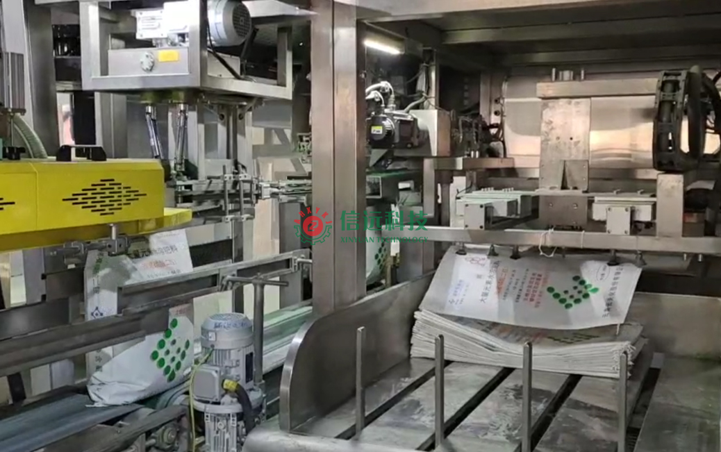 安徽信遠(yuǎn)包裝科技有限公司設(shè)計制造的水溶肥全自動包裝碼垛生產(chǎn)線設(shè)備,是一套固體粉劑重袋包裝碼垛系統(tǒng),由上袋機(jī)、包裝機(jī)、縫包機(jī)、噴碼機(jī)、輸送理包系統(tǒng)、碼垛機(jī)器人和托盤庫等裝置組成,可以自動完成取袋、上袋、開袋、套袋、夾袋和計量充填,袋內(nèi)重量達(dá)到設(shè)定值時,自動停止充填并松袋落袋,抱袋裝置自動移栽至縫包機(jī)前,完成包裝袋封口。成品袋在輸送過程中,自動完成倒包、振實(shí)、壓平等理包整形后(托盤庫自動同步供盤),機(jī)器人進(jìn)行抓包碼垛,叉車搬運(yùn)入庫。