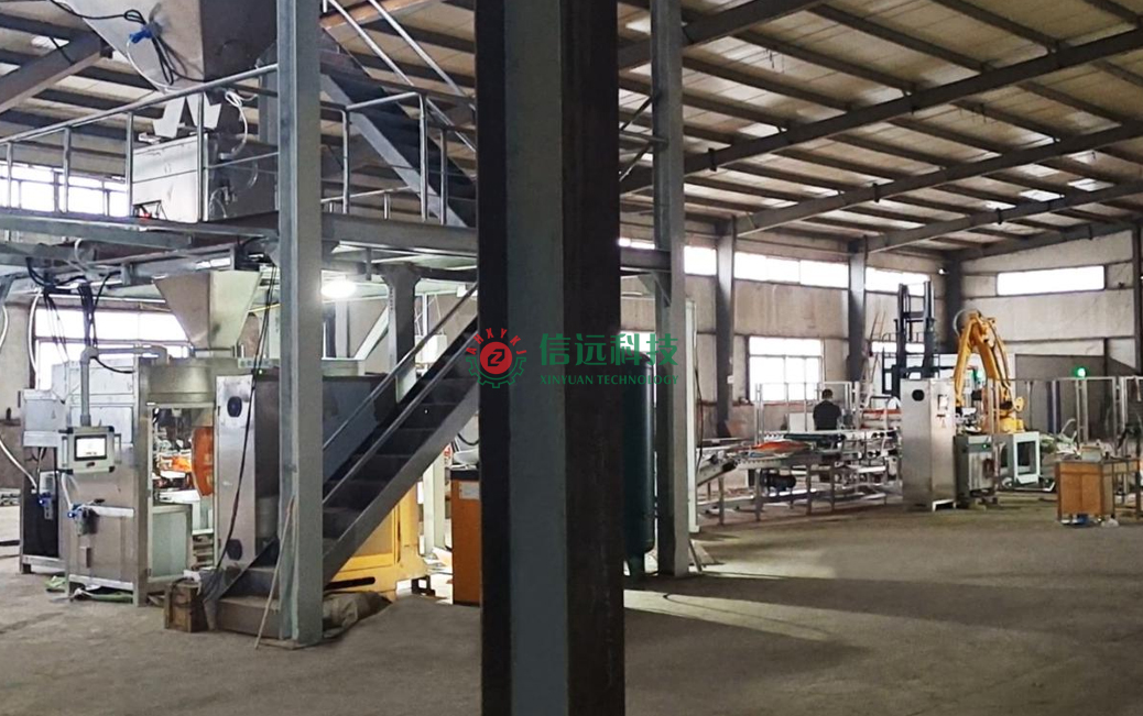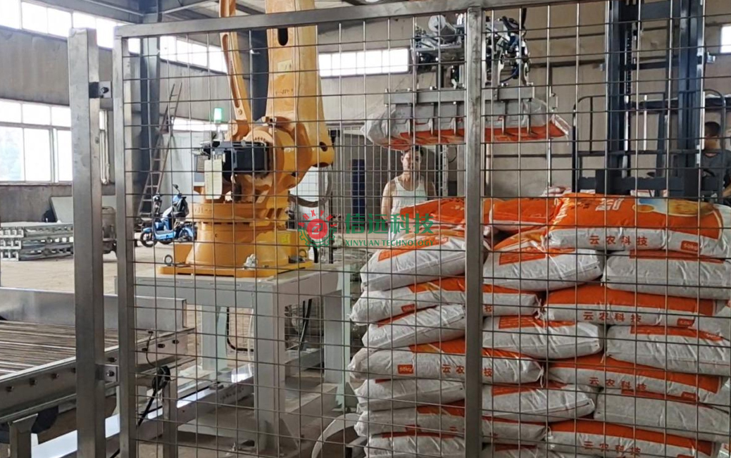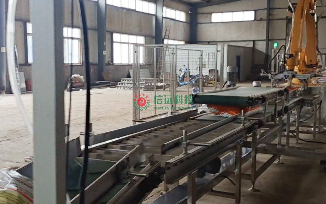 安徽信遠(yuǎn)包裝科技有限公司設(shè)計制造的摻混肥全自動包裝碼垛生產(chǎn)線設(shè)備,是一套重袋包裝碼垛系統(tǒng),由上袋機(jī)、包裝機(jī)、縫包機(jī)、噴碼機(jī)、輸送理包系統(tǒng)和碼垛機(jī)器人等裝置組成,可以自動完成取袋、上袋、開袋、套袋、夾袋和計量充填,袋內(nèi)重量達(dá)到設(shè)定值時,自動停止充填并松袋落袋,抱袋裝置自動移栽至縫包機(jī)前,完成包裝袋封口。成品袋在輸送過程中,自動完成倒包、振實、壓平等理包整形后,機(jī)器人進(jìn)行抓包碼垛,叉車搬運(yùn)入庫。