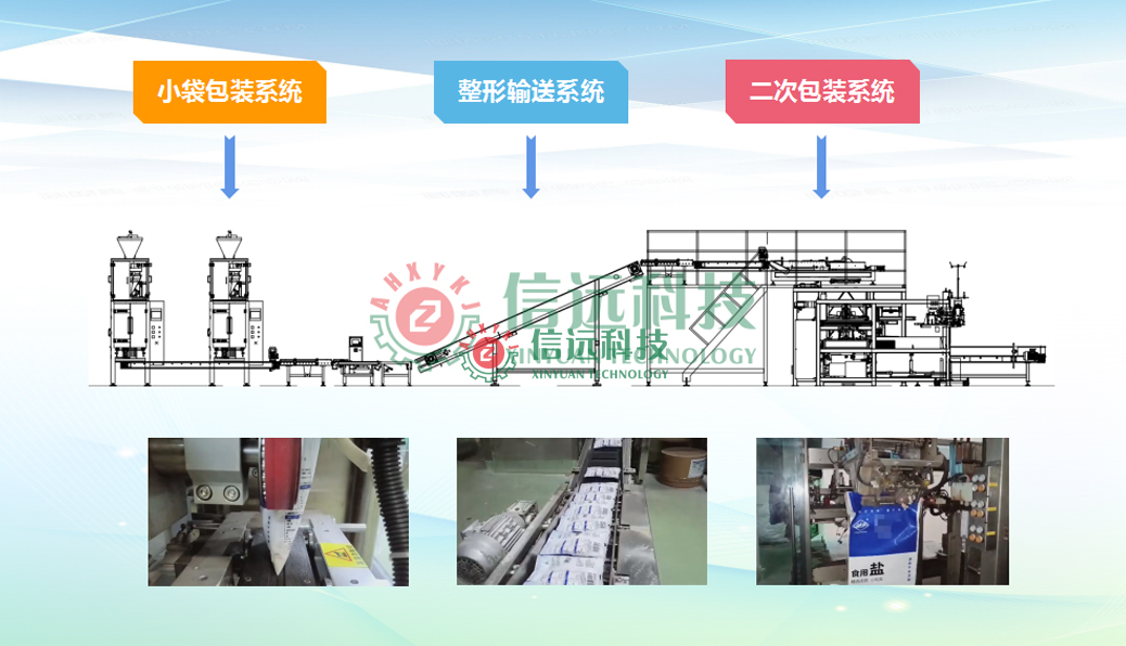 信遠(yuǎn)科技食鹽/砂糖包裝生產(chǎn)線設(shè)備,由提升裝置把物料送至緩存?zhèn)},通過量杯式計(jì)量機(jī)對(duì)食鹽/砂糖進(jìn)行定量填充至包裝袋,封口后的包裝袋經(jīng)過重量選別機(jī)和剔除機(jī)完成產(chǎn)品標(biāo)準(zhǔn)化,然后通過夾袋提升裝置送至二次大袋包裝環(huán)節(jié)。小袋包裝機(jī)分為制袋式包裝機(jī)和給袋式包裝機(jī)。整個(gè)包裝過程為無人化運(yùn)行,保證了物料衛(wèi)生與安全。